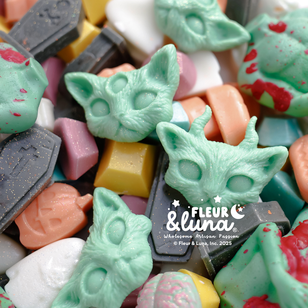 All waxes are made in small batches and hand-poured. Made of natural soy wax and paraffin blend wax, phthalate-free fragrances, ethically sourced mica pigments, & earth friendly sparkles.