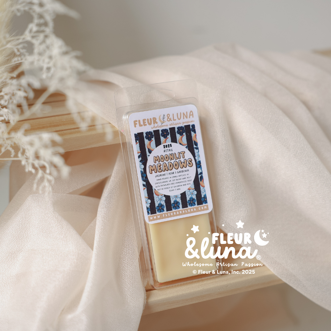 All waxes are made in small batches and hand-poured. Made of natural soy wax and paraffin blend wax, phthalate-free fragrances, ethically sourced mica pigments, & earth friendly sparkles.
